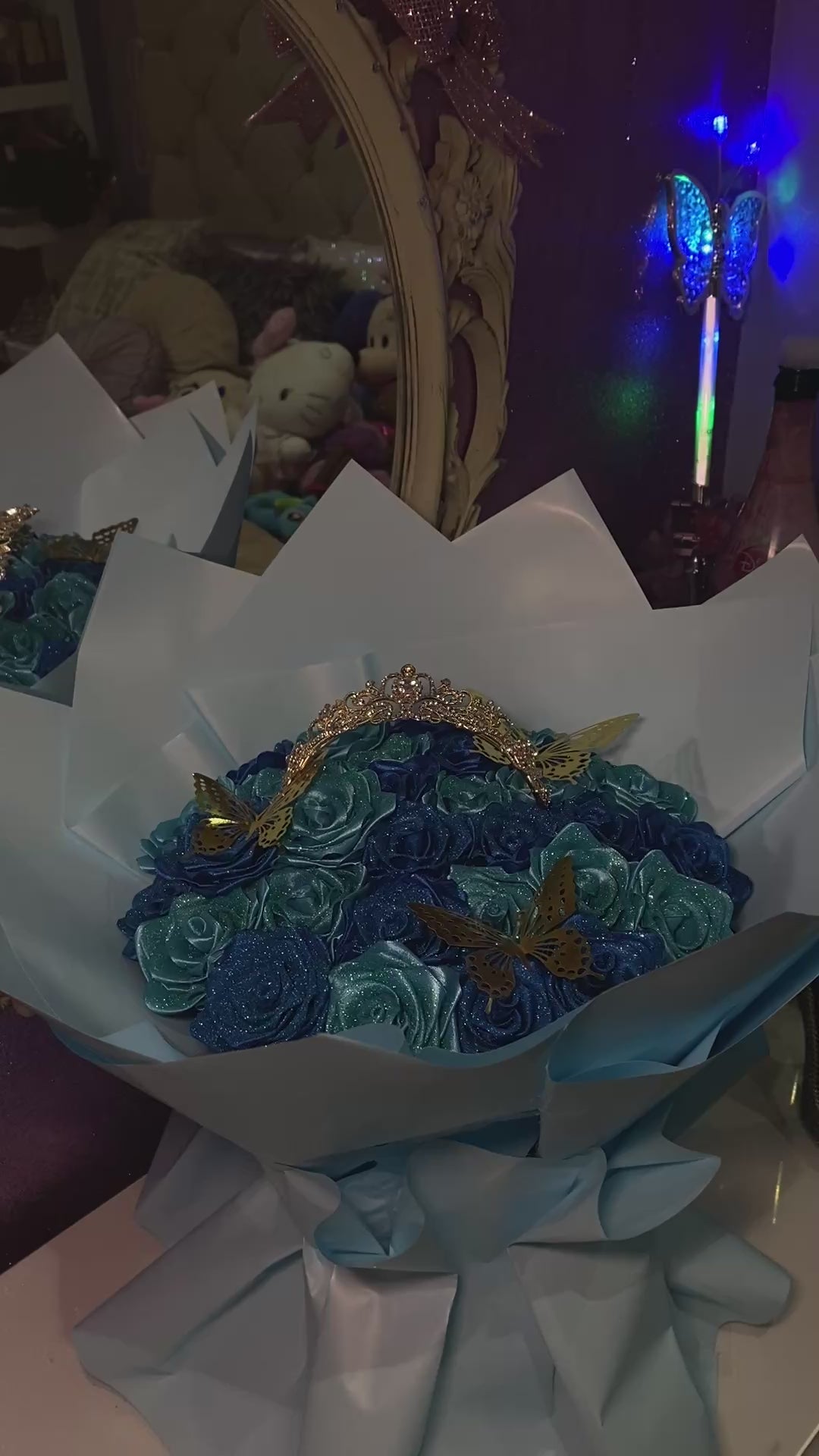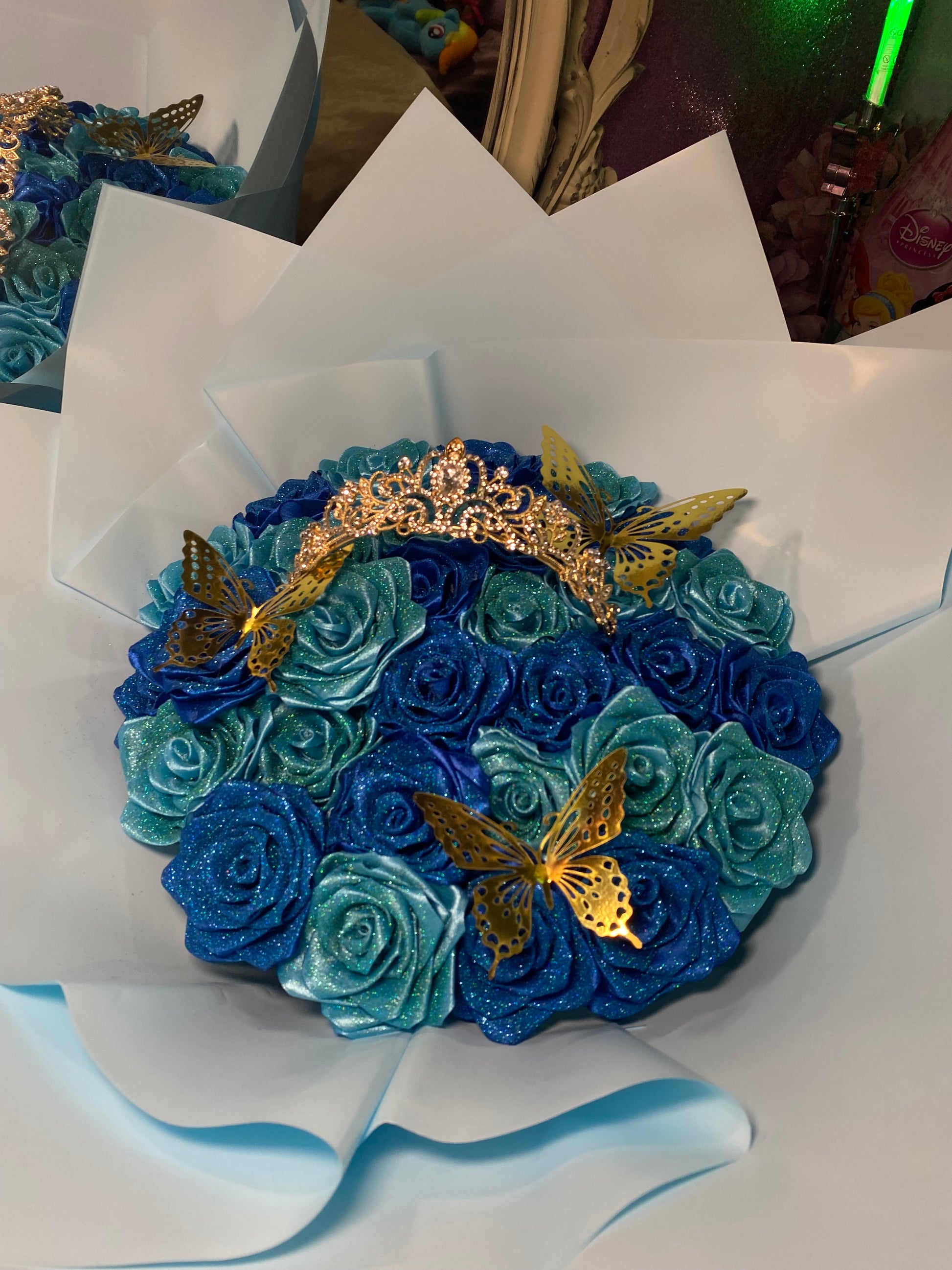 This elegant 30 rose glitter tiara bouquet adds a touch of sparkle to any special occasion. With a glitter coat and delicate butterflies, this bouquet comes in two beautiful shades - dark blue + light blue or light pink + dark pink. Perfect for weddings, proms, or any event in need of a glamorous touch.👑🦋
