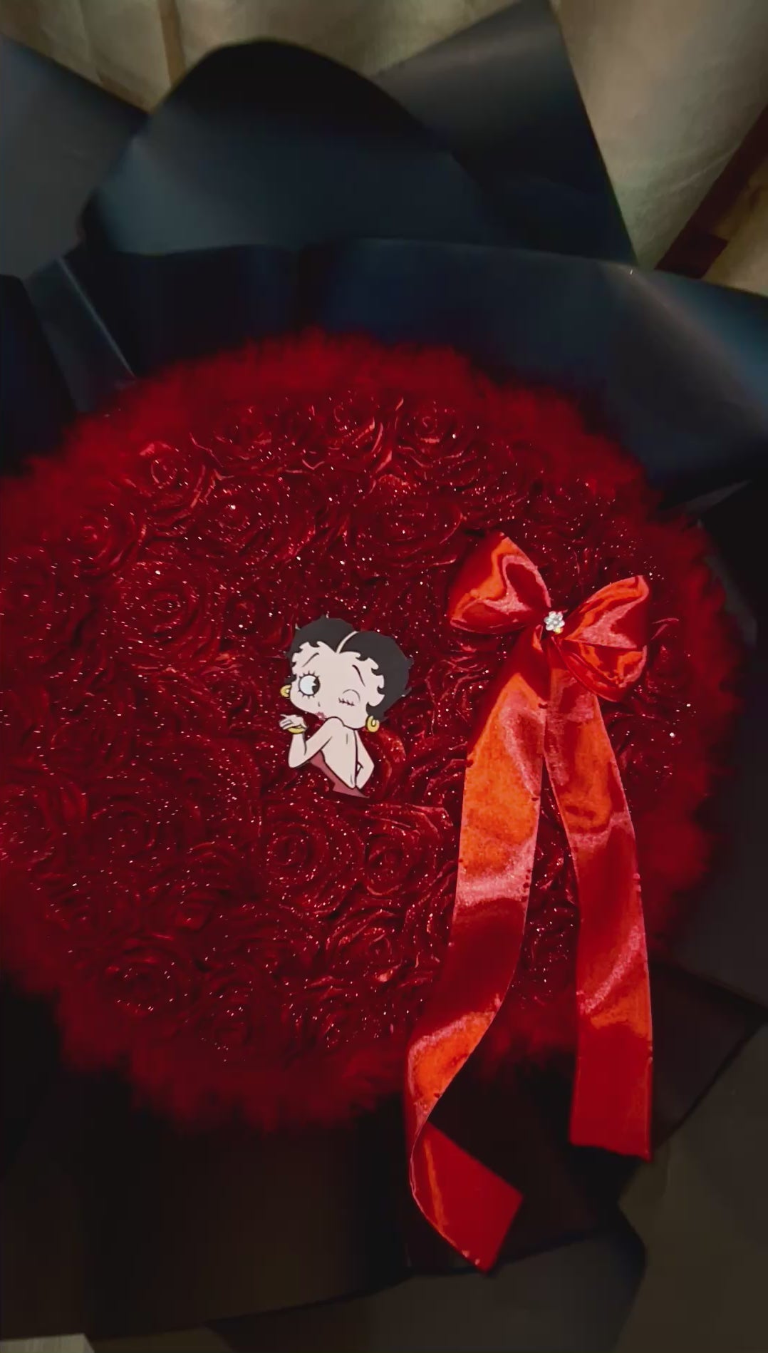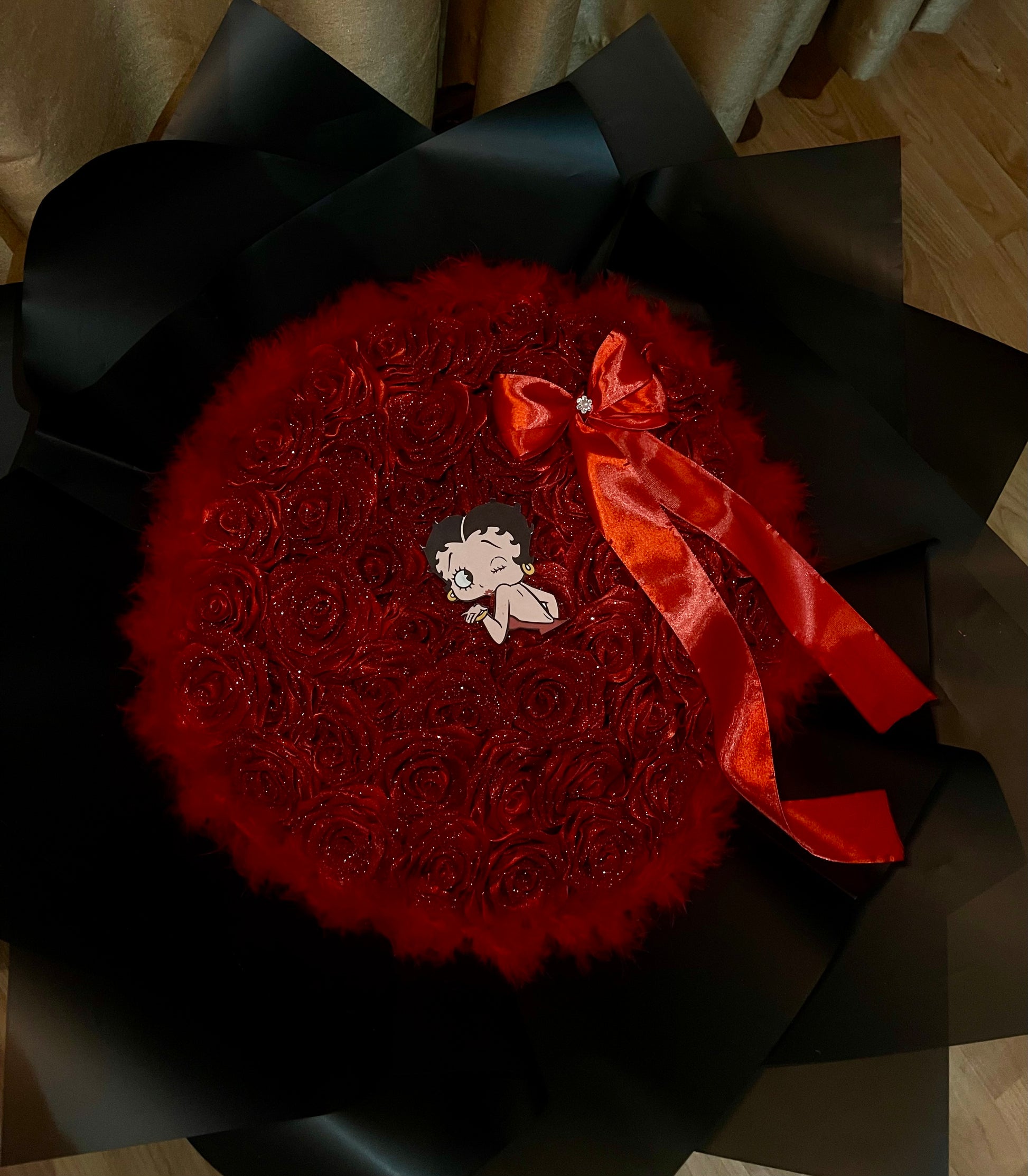 Add a touch of glamour to any occasion with our 70 Rose Betty Boop Bouquet. Coated in glitter and adorned with a bow, this bouquet will make a statement. Perfect for any Betty Boop fan or anyone looking for a playful touch to their décor!🌹🖤❤️