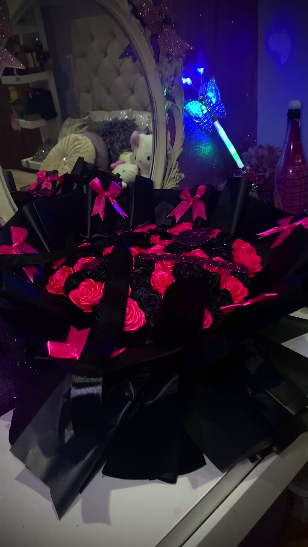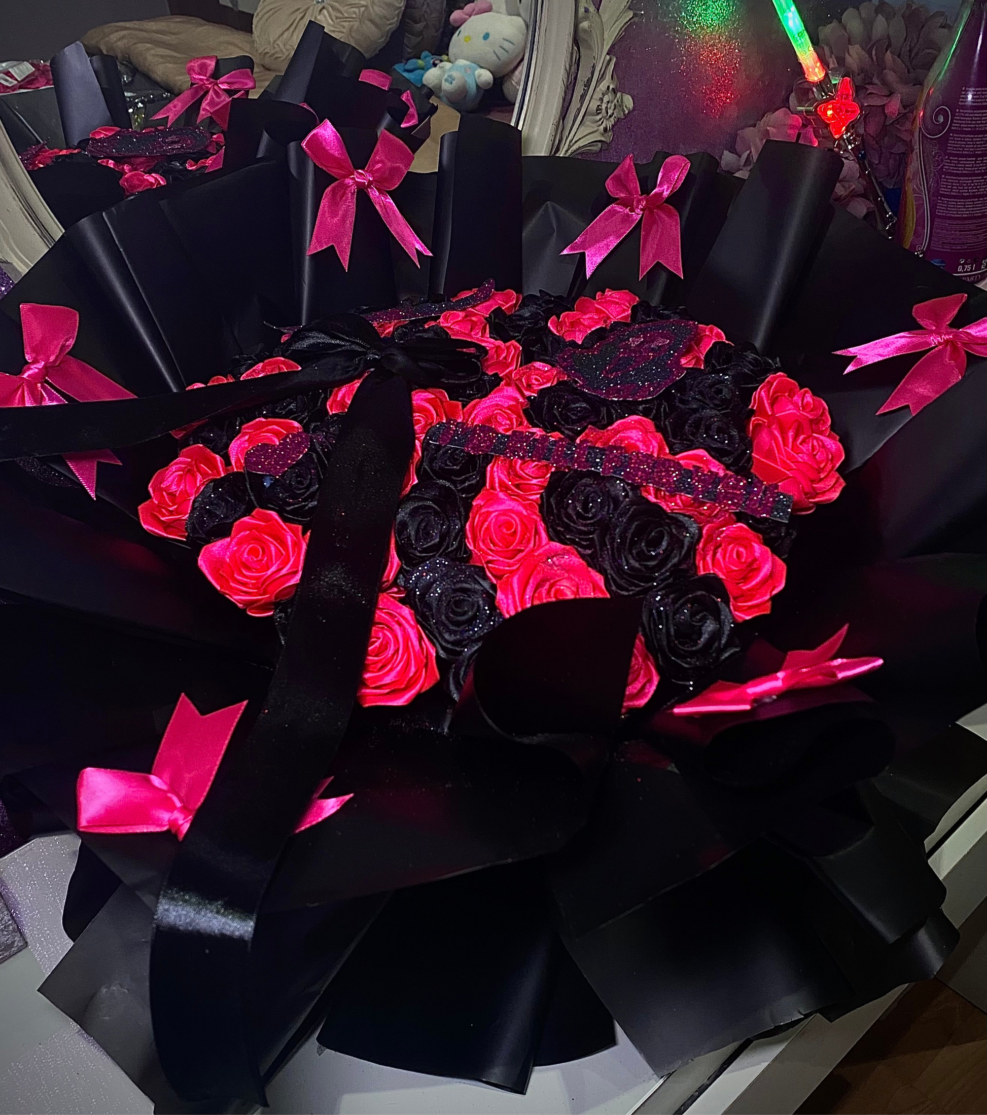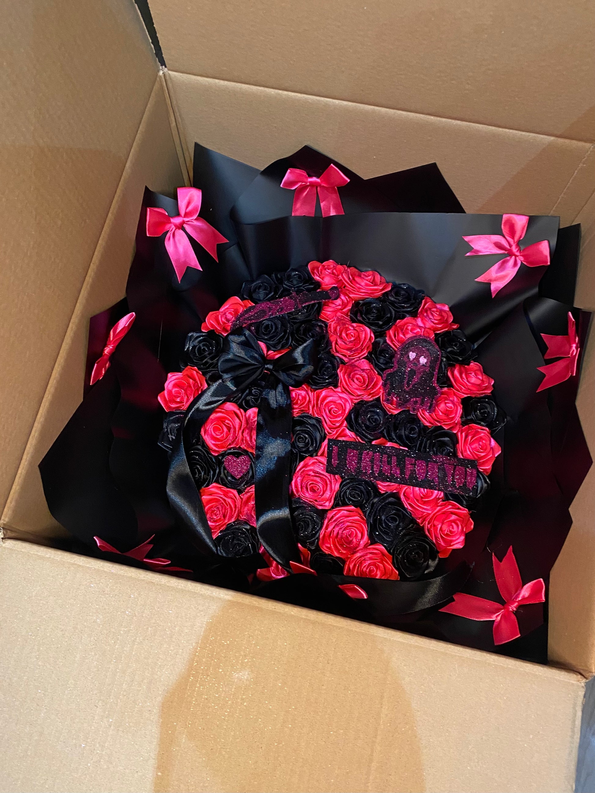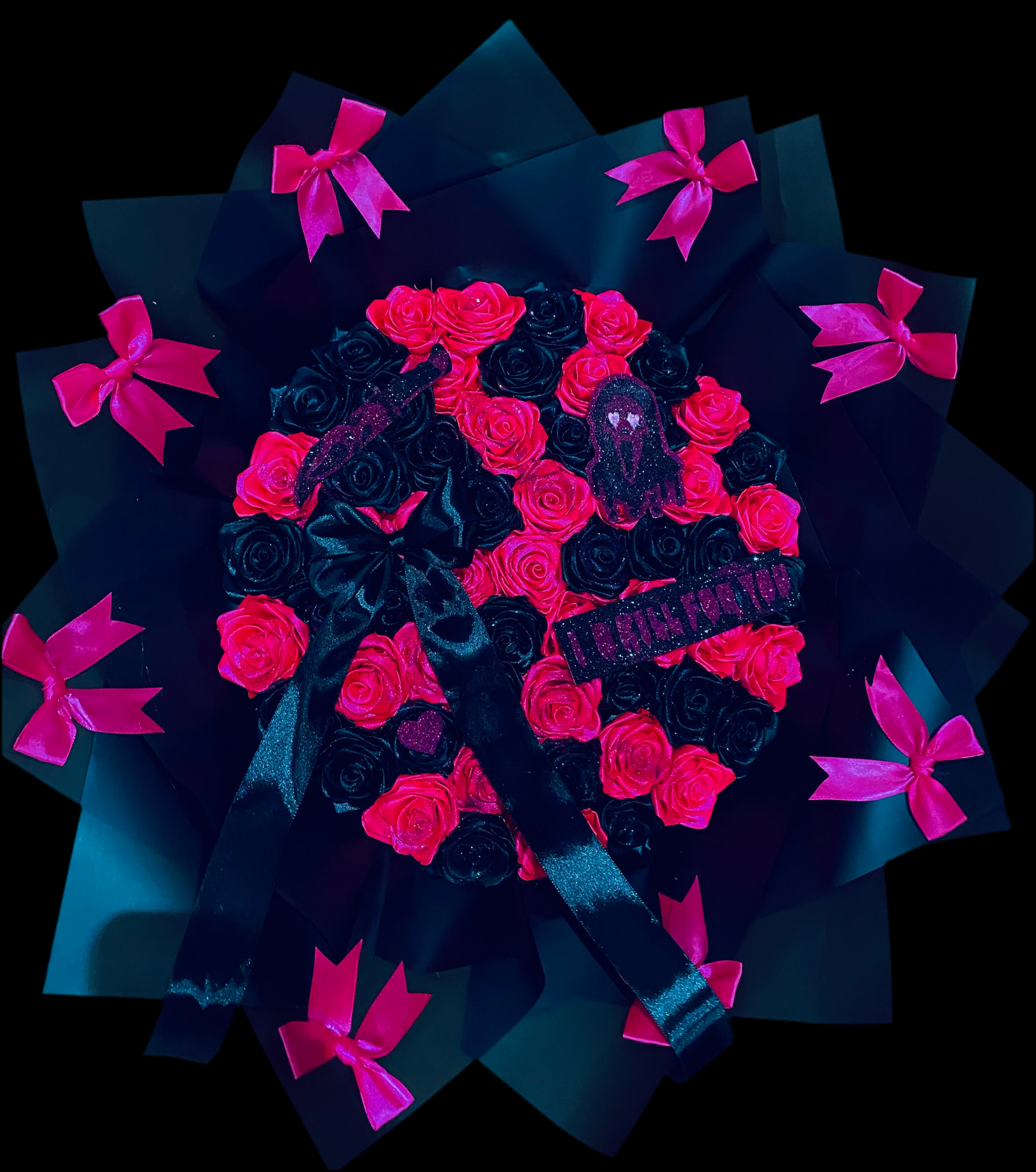 Declare your love with our I’DKILL4YOU Bouquet💀💐 featuring 70 black and pink roses adorned with glitter and bows🎀. The ghost face design and 'I’D KILL FOR YOU' wording add a touch of romance to this unique bouquet. Perfect for special occasions or just because!🖤