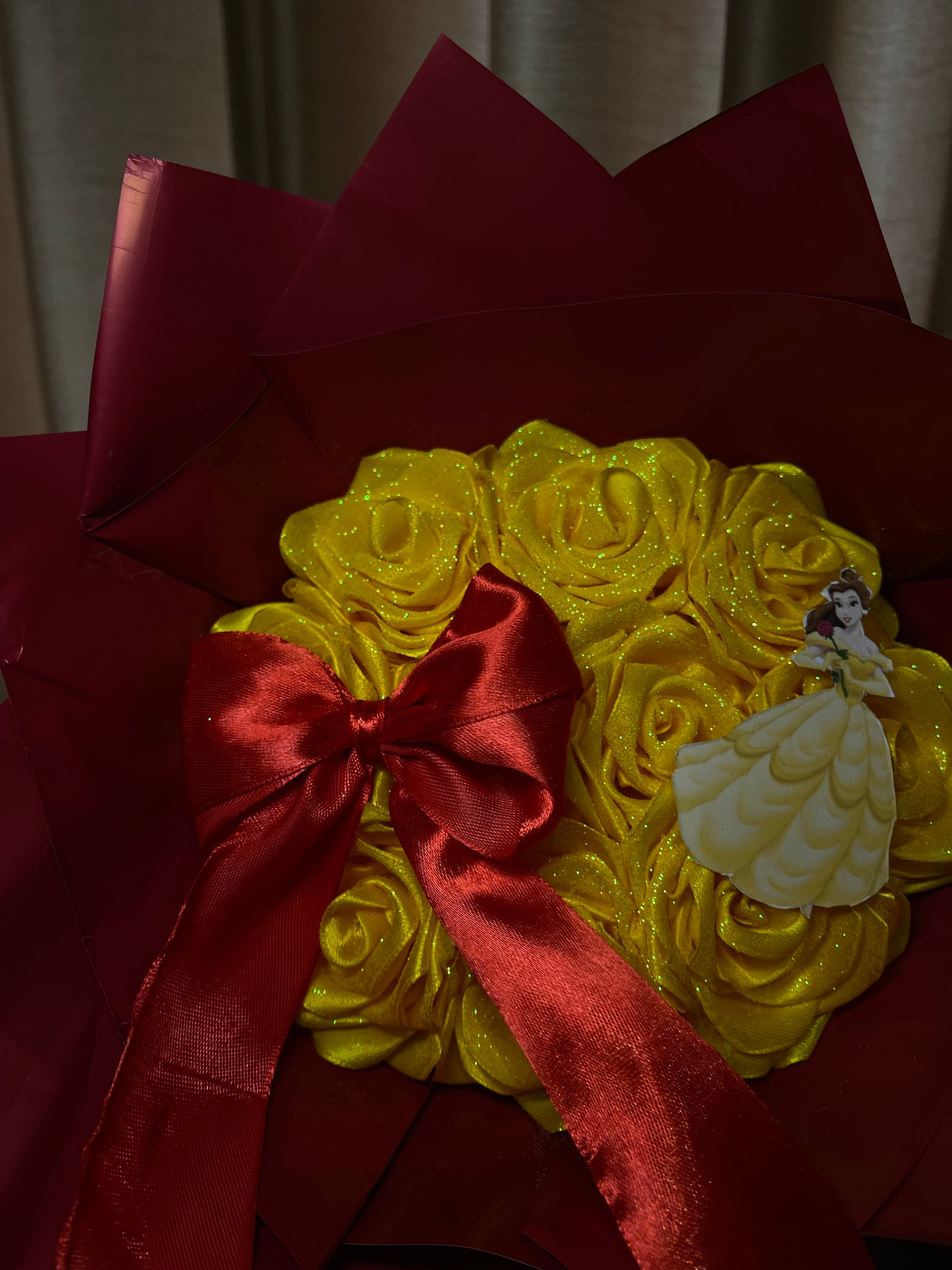 This Mini Belle Bouquet features 10 yellow glitter roses, inspired by the iconic tale of Beauty and the Beast. Add a touch of enchantment to any occasion with this stunning bouquet. Perfect for Disney fans and lovers of all things magical.🪄✨