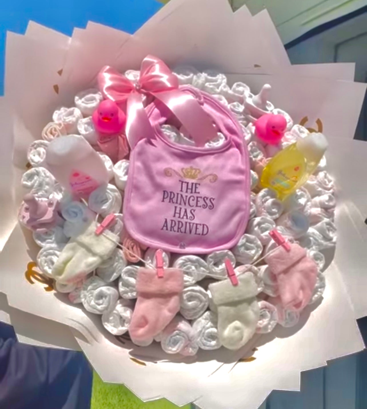 Introducing the Nappy Bouquet - the perfect gift for baby showers! This beautifully arranged bouquet is filled with essential nappies that every new parent will appreciate. Show your love and support with this practical and thoughtful gift!🩷🩵